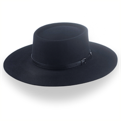 Embrace the Western spirit with the Mojave, a black vaquero cowboy hat crafted from durable fur felt for style and longevity. Featuring a unique telescope crown and a flat 3 5/8" brim, this hat provides comfort and protection while adding a bold touch to any look. Handcrafted to your exact measurements and customizable in a variety of colors, the Mojave ensures a perfect fit and personal flair. The genuine leather sweatband and viscose satin lining guarantee all-day comfort, making this hat ready for any adventure. Delivered in a protective hat box with a complimentary organic cotton drawstring bag, it’s as practical as it is stylish.