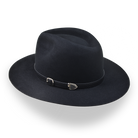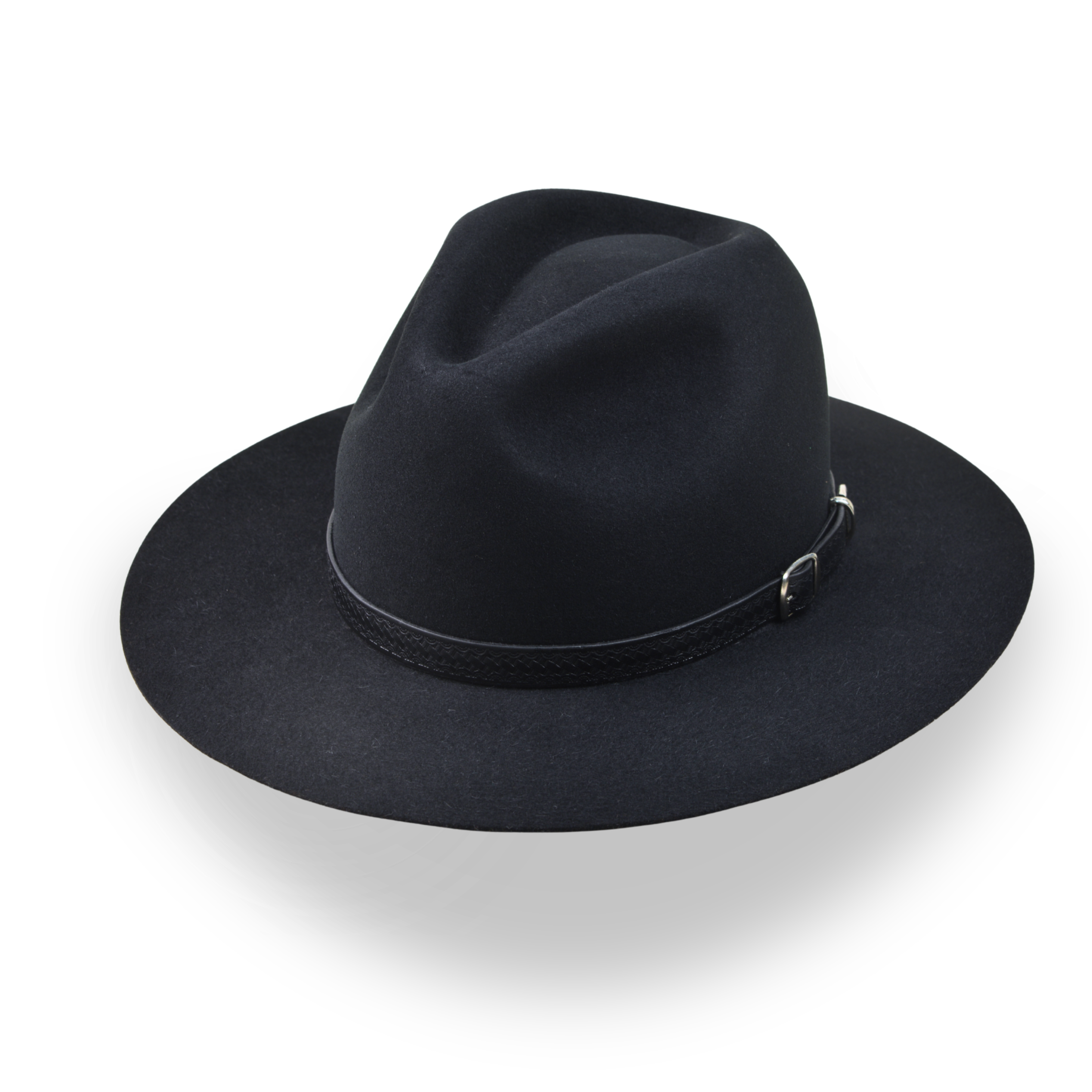 Formet av tett sort kaninfilt, holder den sin rene profil gjennom vind, regn og reise. Den 4 ¾″ tåreformede kronen gir selvsikker høyde uten å bli klumpete, mens den 3″ flate bremmen skjermer mot gjenskinn og vær. Det svarte lærhattebåndet gir en diskret tekstur—funksjonell tilbakeholdenhet fremfor prangende detaljer.