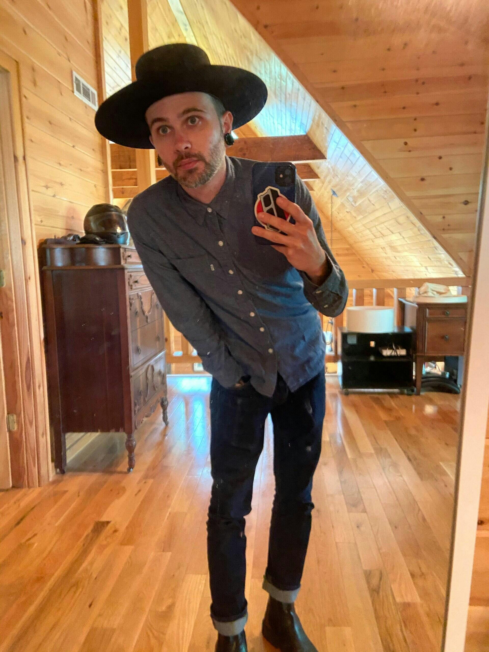 Person wearing a black apron with gold text, holding a black hat in a workshop setting.